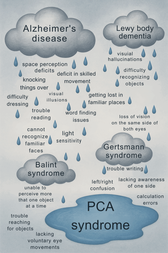 Posterior cortical atrophy (PCA) is a progressive neurodegenerative syndrome that initially affects the visual perception system located in the back of the brain. Most cases are found to stem from Alzheimer’s pathology and therefore PCA has been traditionally classified as a rare visual variant of that disease. Over time, the atrophy can spread into other regions of the brain resulting in typical dementia symptoms (e.g., memory issues).