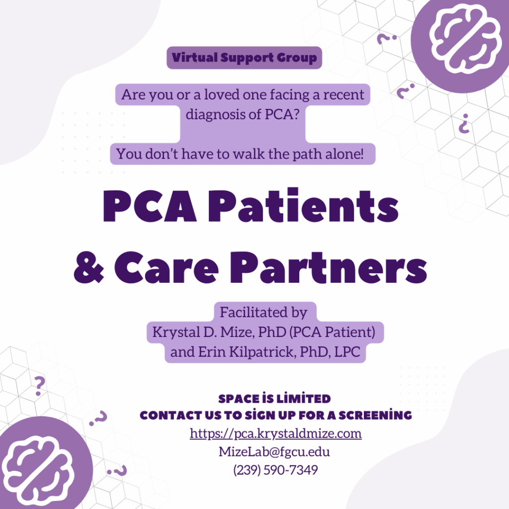 Feeling lost after receiving my diagnosis, I joined a support group. I felt less alone and it gave me a place to learn about living with PCA. Now I want to offer the same to others living through the early stages of PCA. Reach out to see if we have any openings in the group!